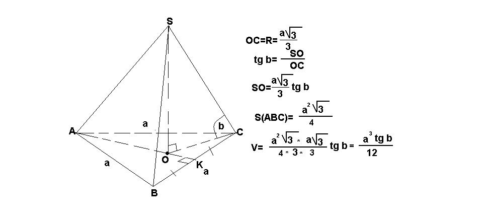 найти объём правильной треугольной пирамиды,если сторона её основания равна А,а боковое ребро образует с плоскостью основания угол В!