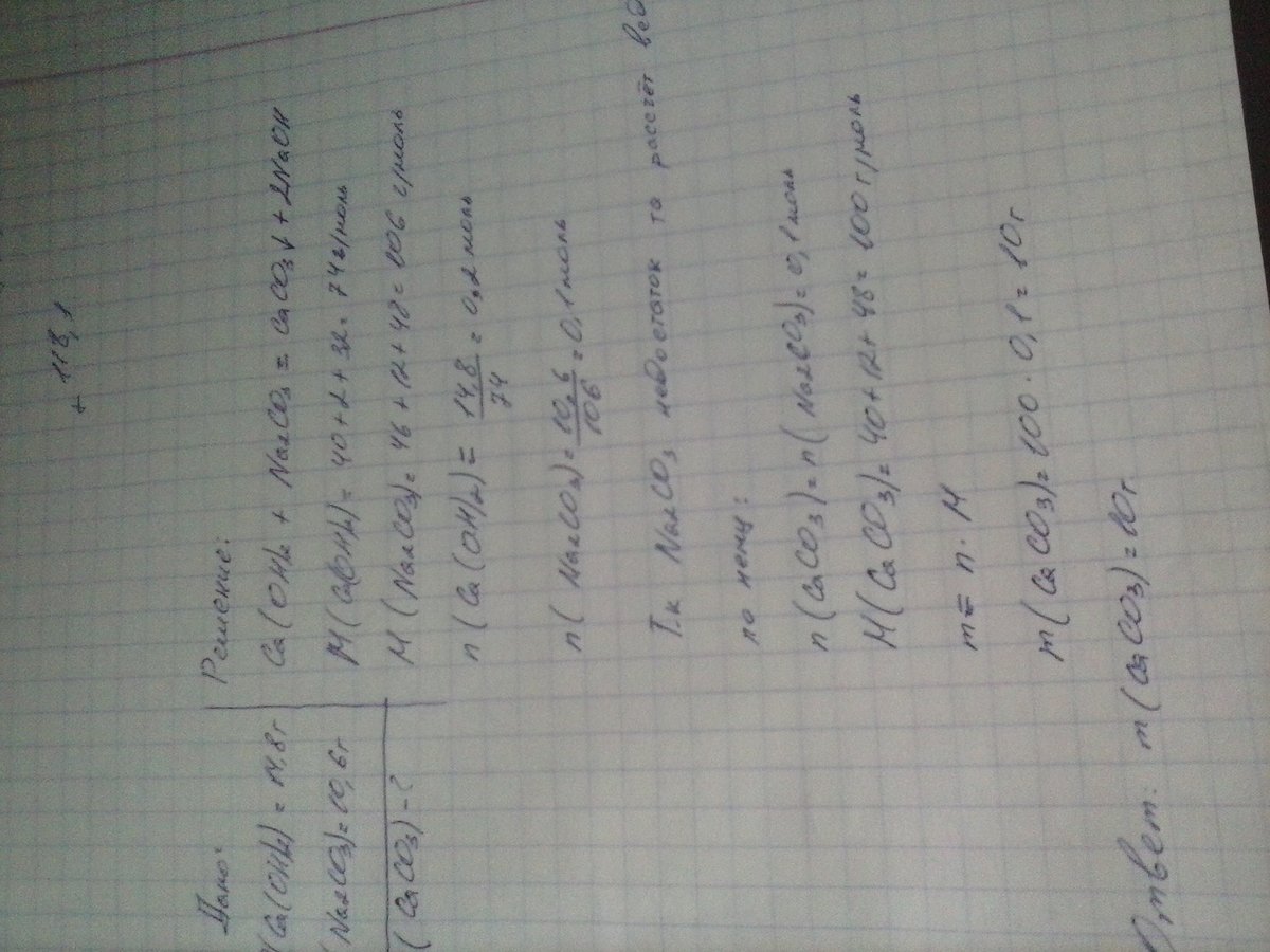 1) К раствору, содержащему 14,8 г Ca(OH)2, прилили раствор, содержащий10,6 г карбоната натрия. Рассчитайте массу образовавшегося осадка.