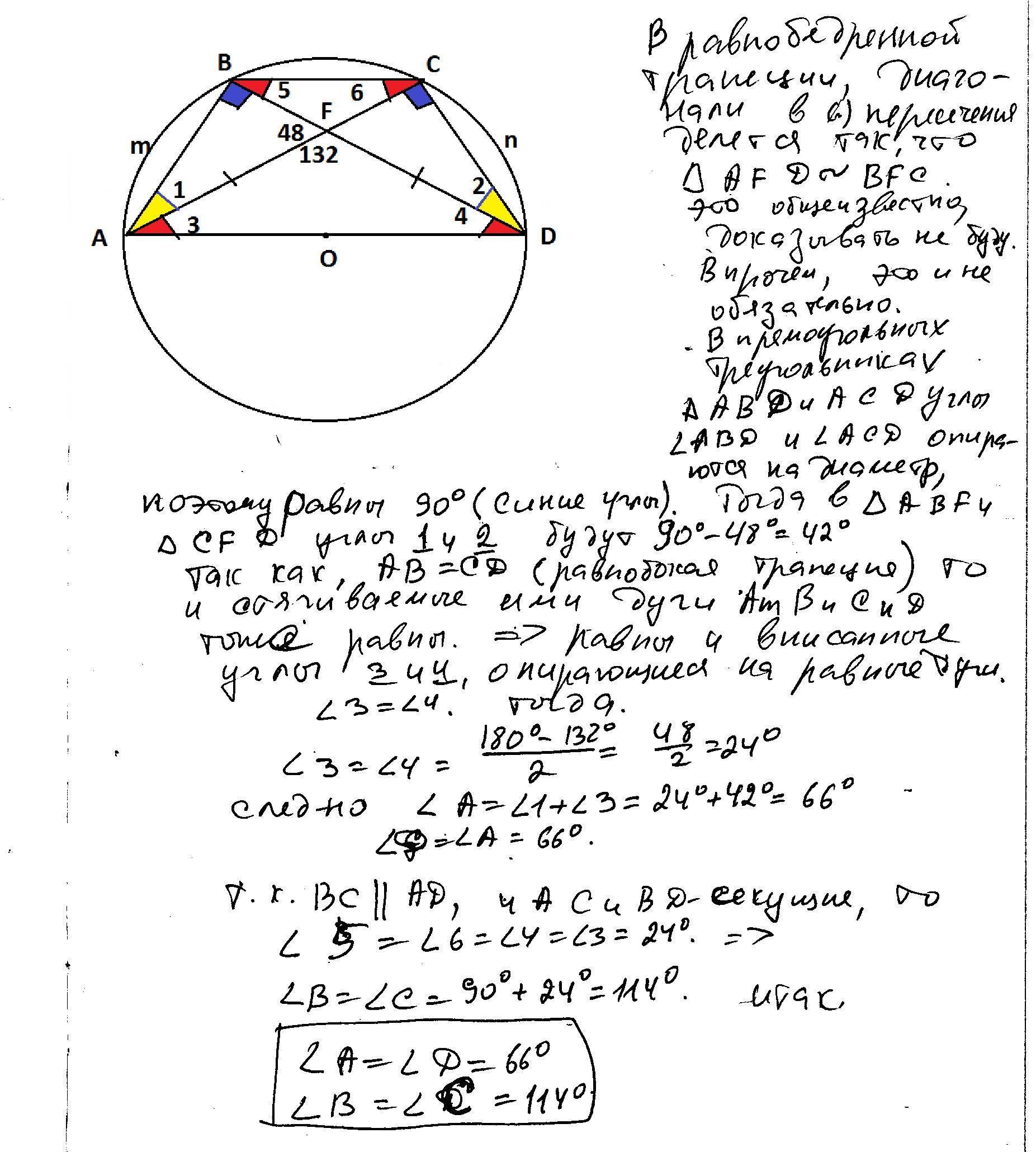 Равнобедренная трапеция вписана в окружность так,что центр окружности принадлежит одному из оснований.Найдите углы трапеции,если один из углов между её диагоналями равен 48 градусам.
