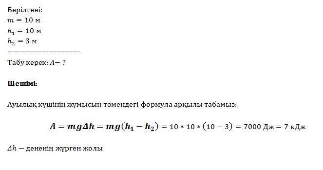 массасы 100кг дене 10 м биіктіктен биіктігі 3м үйдің төбесіне құлап түсті.Ауырлық күшінің істеген жұмысы қандай?