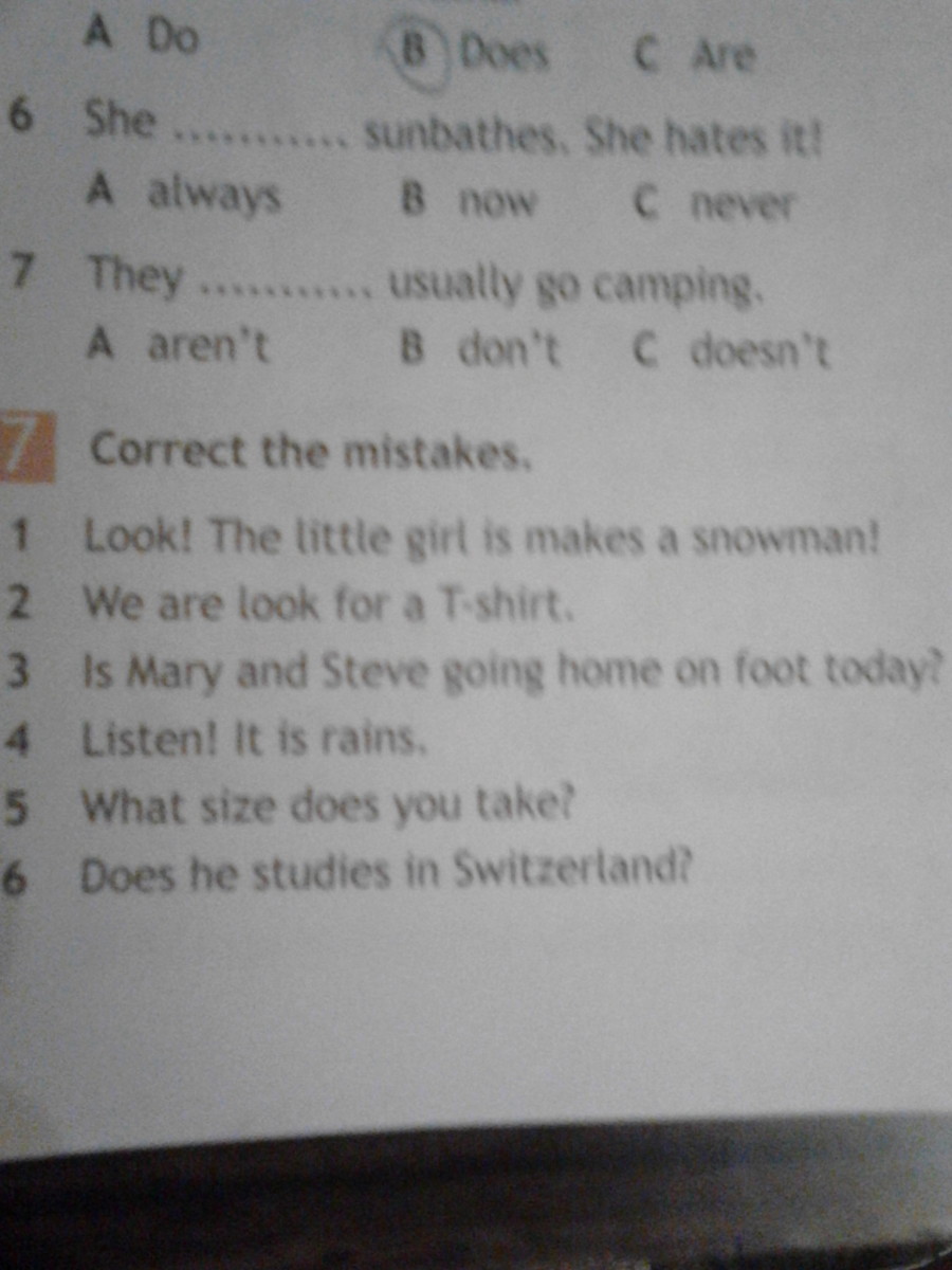 1. Look! This girl is making snowman! 2. We are looking for a T-shirt. 3. Are Mary and Steve going home on foot today? 4. Listen! It is raining. 5. What size do you take? 6. Does he study in Switzerland?