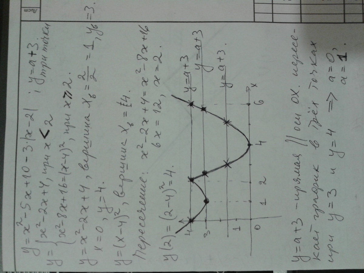 постройте график функции y=x²-5x+10-3Ιx-2Ι и найти все значения a, при которых он имеет ровно три общие точки с прямой y=a+3