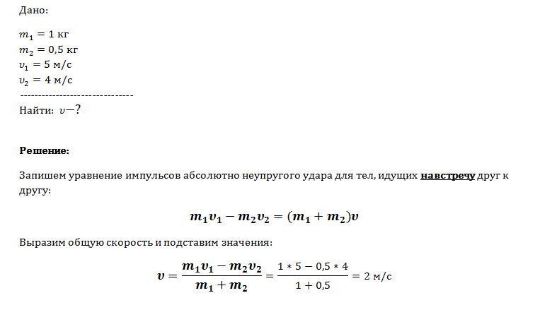 два шара массами 1кг и 0.5кг движутся навстречу друг другу со скоростями 5м/с и 4м/с.какова скорость шаров после неупругого удара.