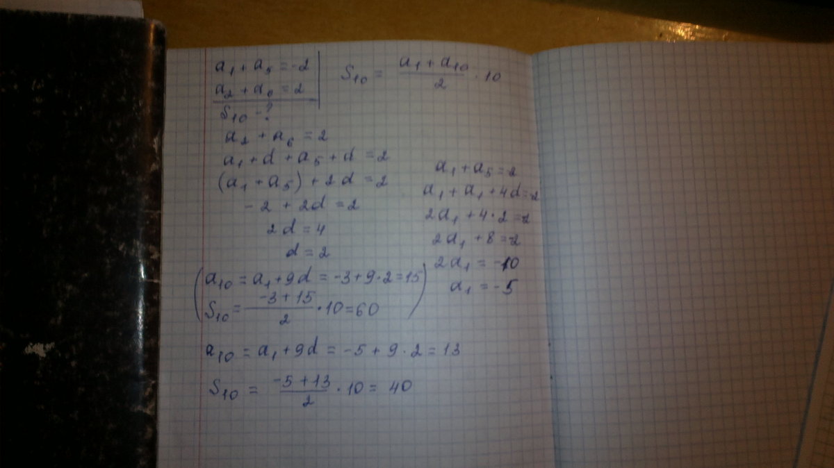 Сумма первого и пятого членов арифметической прогрессии равна -2, а сумма второго и шестого ее членов равна 2. Найти сумму десяти первых членов прогрессии.