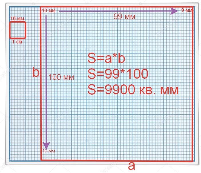 2. Если S=9900 кв. мм, то а и b могут быть равны 99 мм и 100 мм, соответственно. (99*100=9900)