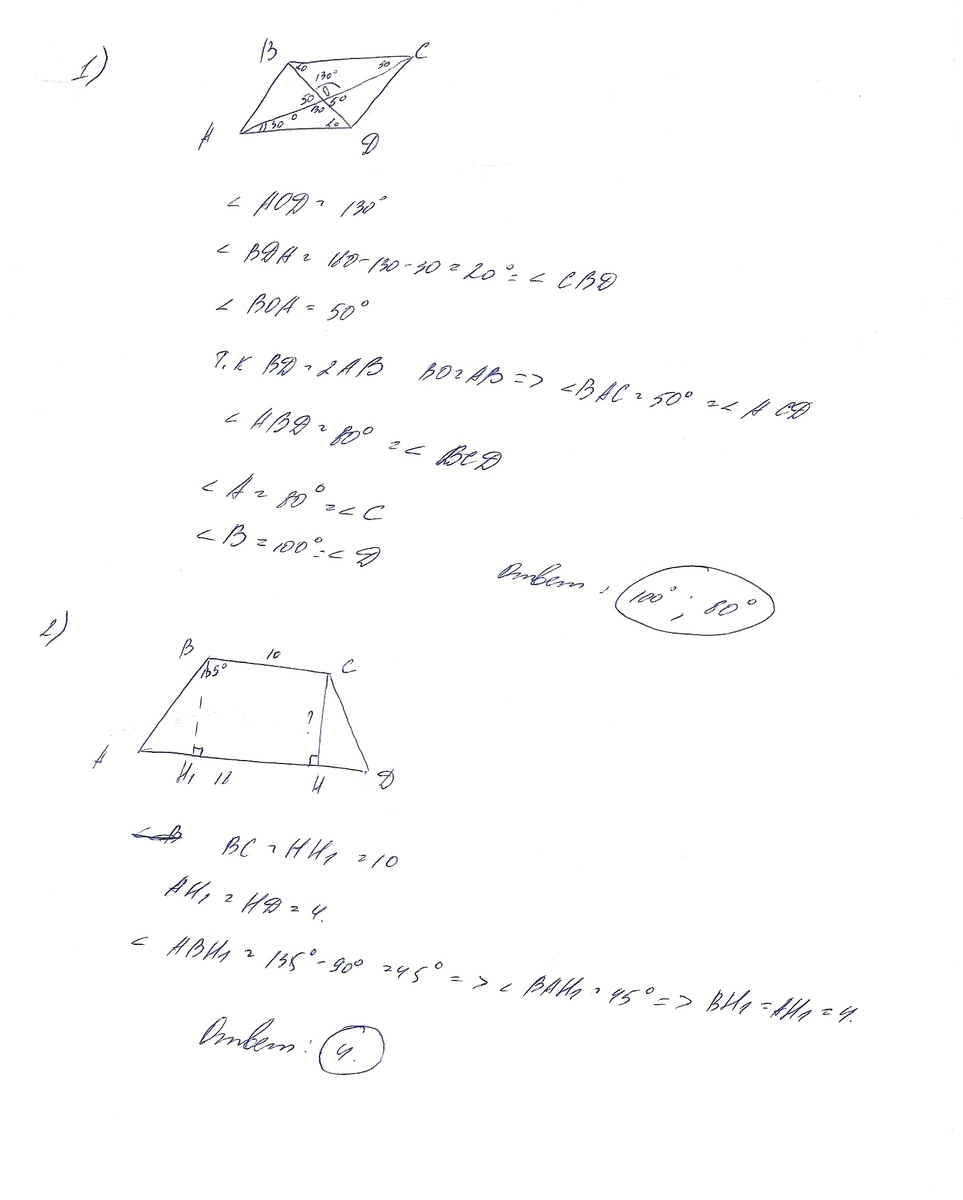 1)В параллелограмме ABCD диагонали пересекаются в точке О, угол СОВ= 130 градусов, угол САD=30 градусов и BD=2АВ.Найдите углы параллелограмма. 2)В равнобедренной трапеции ABCD с основаниями BC и AD угол B=135 градусов, BC=10, AD=18.Найдите высоту трапеции.