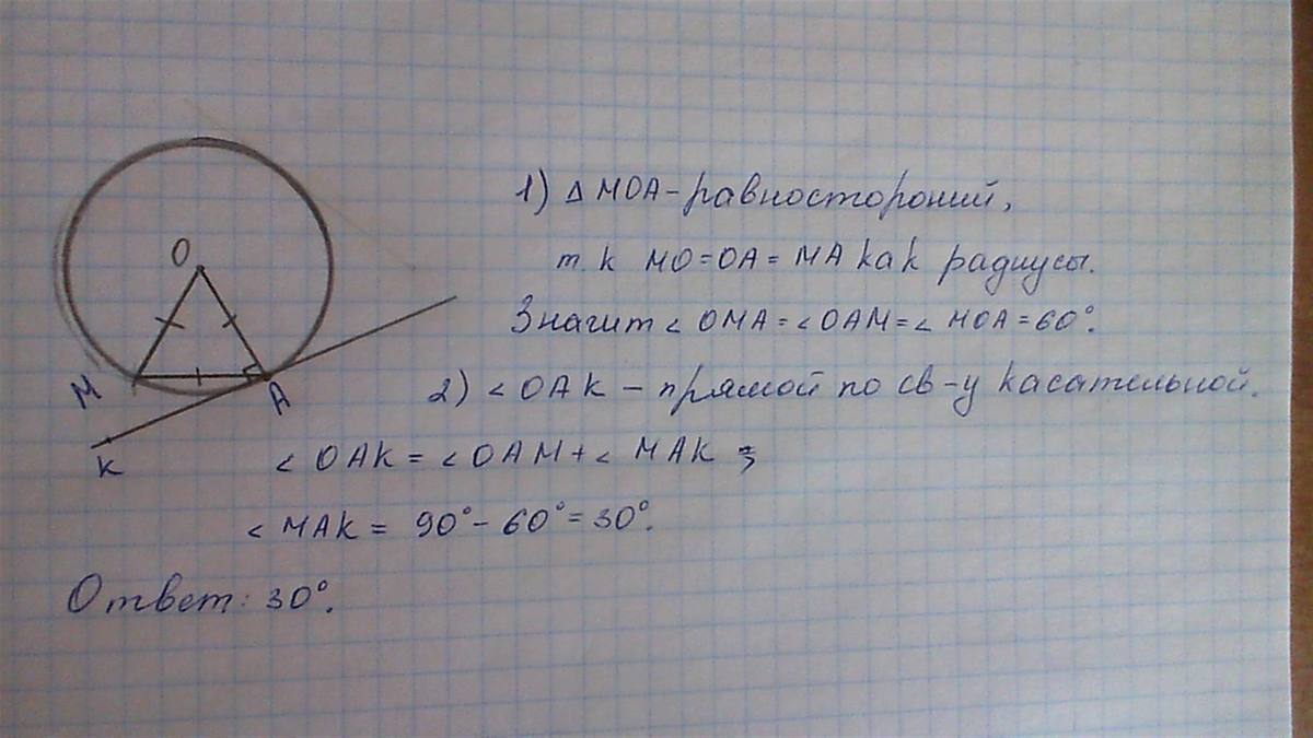 Через точку данной окружности проведены касательная и хорда,равная радиусу.Найдите угол между ними.