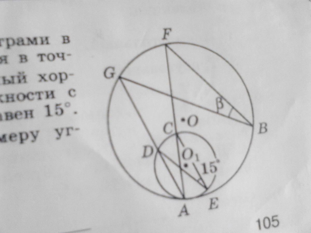 Две окружности с центрами в точках О и О1 касаются в точке А. Угол, образованный хордами СЕ и DЕ окружности с центром в точке О1, равен 15 градусов. Найдите градусную меру угла β