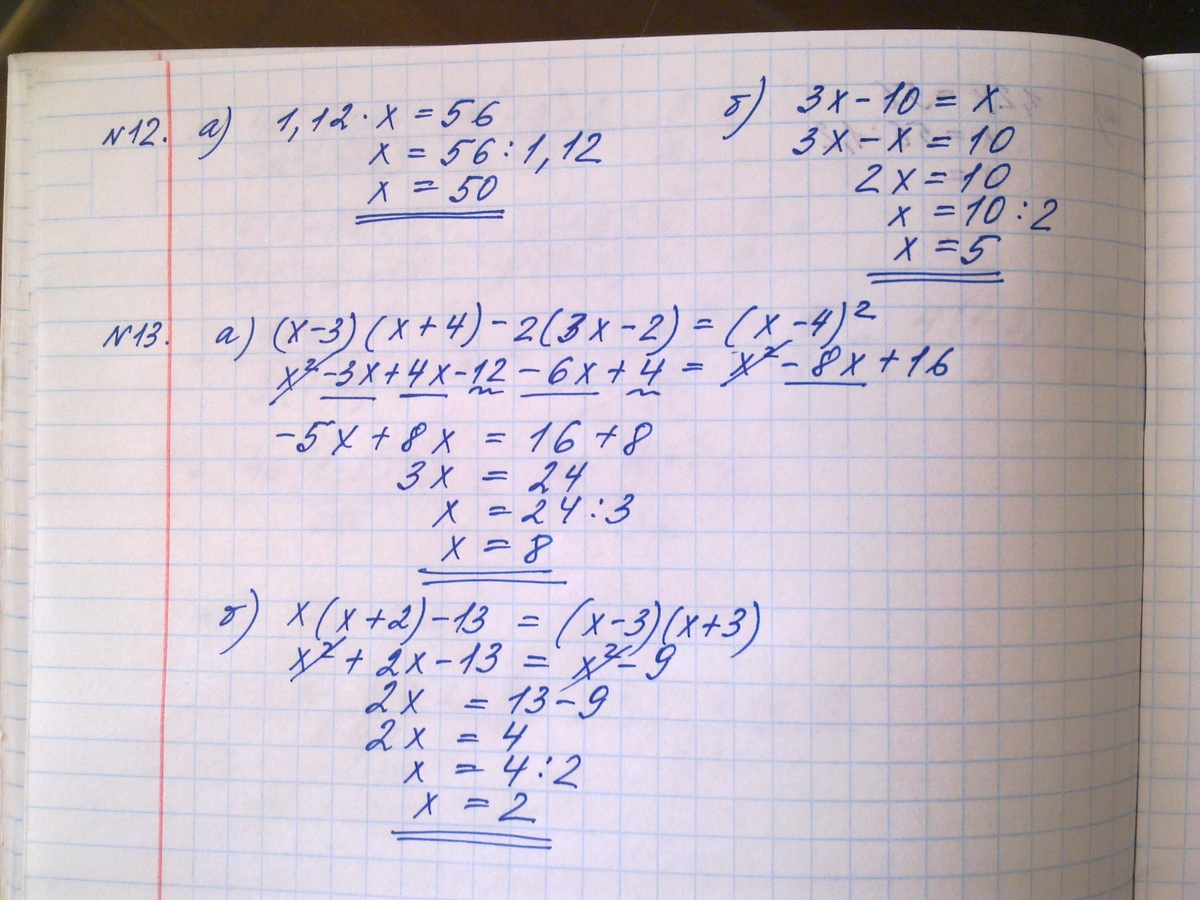 Номер 12 Запишите каждое предложение в виде уравнения и решите на его множестве R:а)Если число х увеличить на 12% то получим число 56. б) Число 3х на 10 больше числа х .Номер 13 Решите на множестве R уравнение ;а)(x-3)(x+4)-2(3x-2)=(x-4)² б) x(x+2)-13=(x-3)(x+3)
