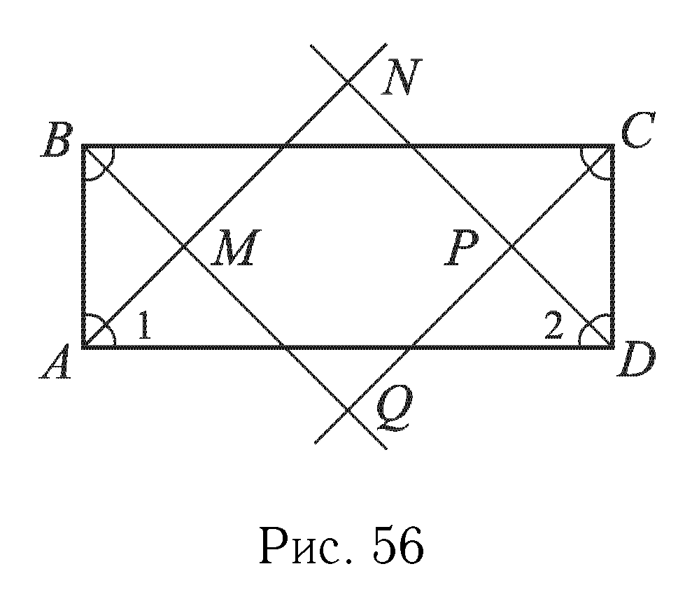 Решение. Пусть MNPQ — четырехугольник, образованный при пересечении биссектрис углов прямоугольника ABCD (рис. 56).