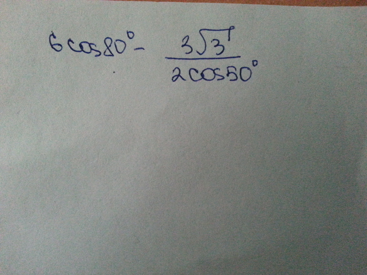 приведем к общему знаменателю (12cos80*cos50-3sqrt3)/2cos50 по формуле преобразования произведения в сумму получим (12*1/2(cos(130) +cos(30))-3sqrt3)/2cos50 (130=80+50 30=80-50) заметим что сos30=sqrt3 /2 cos130=cos180-50=-cos50 (-6cos50+3sqrt(3)-3sqrt(3))/2cos50=-6cos50/2cos50=-3 ответ:-3