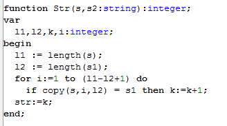 и т.д. до самого конца. Если рассматриваемая нами подстрока равна заданному слову, то мы увеличиваем счётчик k на 1, после завершения цикла мы просто возвращаем значение нашего счётчика - количество вхождений заданного слова в строку.