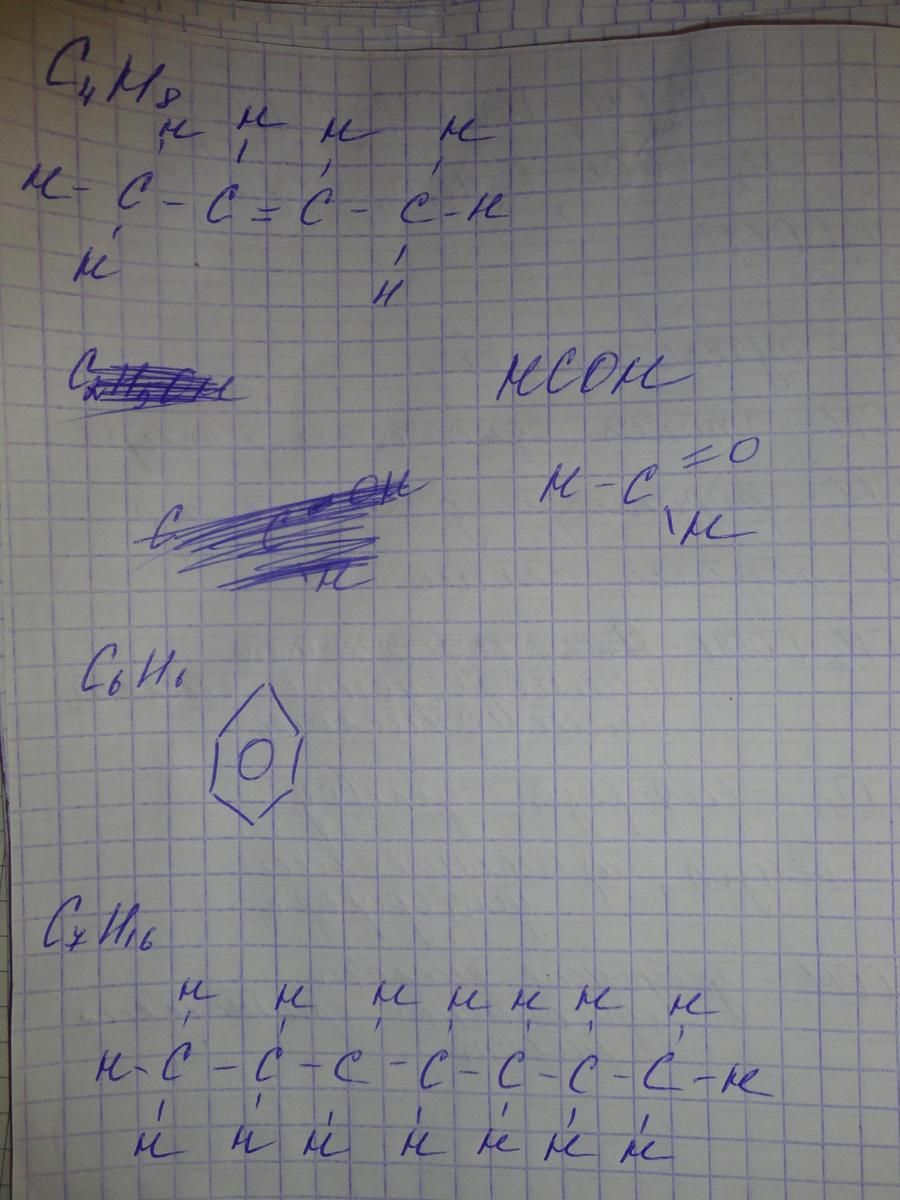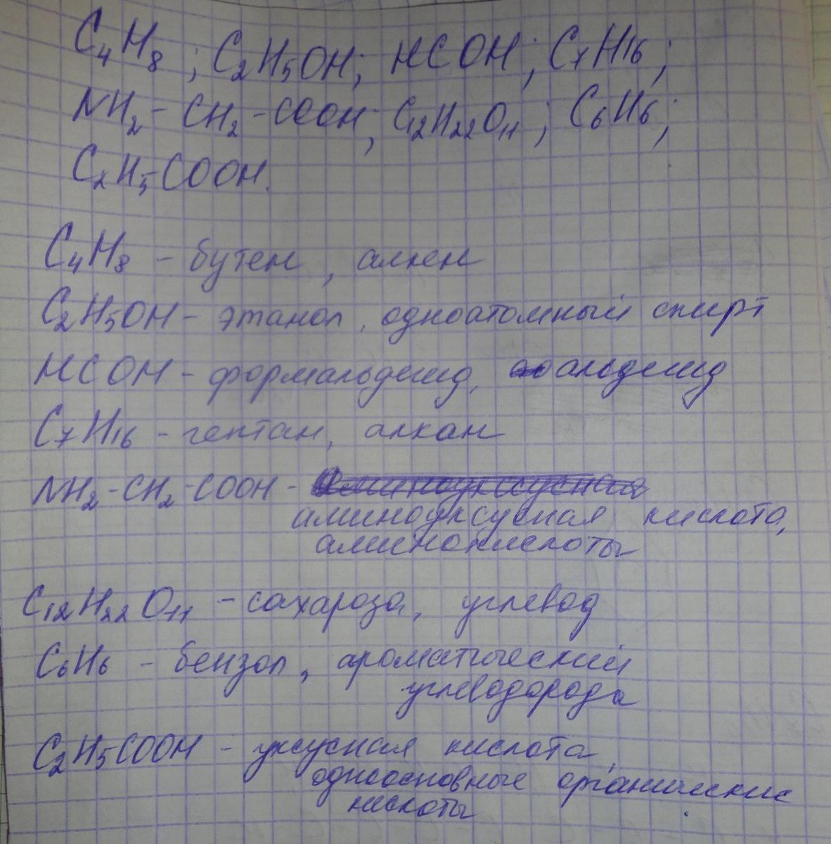 Даны вещества: C4H8, C2H5OH, HCOH, C7H16, NH2-CH2-COOH, C12H22O11, C6H6, C2H5COOH. Назовите все вещества и укажите, к какому классу органических соединений они принадлежат. Составьте полные структурные формулы любых четырех соединений