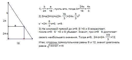 Найдите диагональ прямоугольника наибольшей площади, вписанного в прямоугольный треугольник с катетами 18 и 24, и имеющий с ним общий прямой угол.