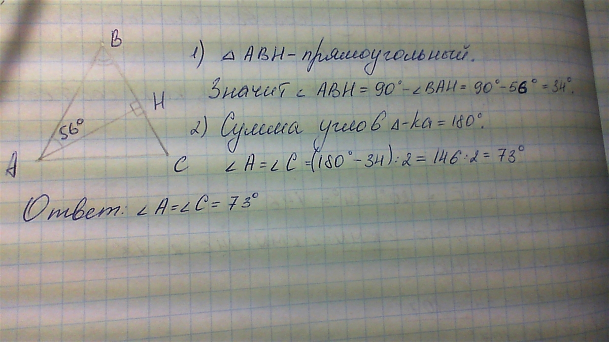 Угол между высотой равнобедренного треугольника, проведенной к боковой стороне и другой боковой стороной равен 56 градусов, Вычислите градусную меру угла при основание данного трекгольника