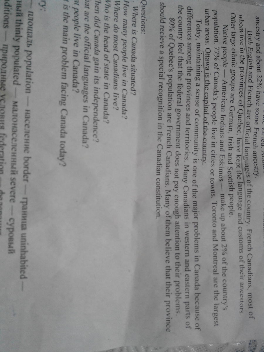 Коренные жители - американские индейцы и эскимосы - составляют примерно 2% населения страны. 77% канадцев живут в городах или городишках. Торонто и Монреаль самые большие городские районы. Оттава -столица страны.