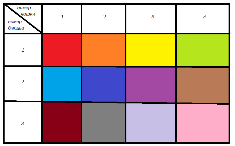 В серванте есть 4 разные чашки и 3 разные блюдца.Все они подходят друг другу.Сколькими способами можно выбрать себе чашку с блюдцем?Составь и заполни таблицу.