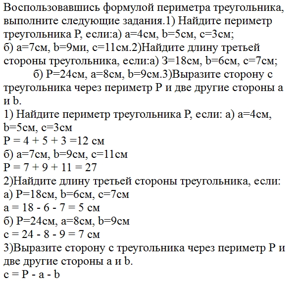 Помогите пожалуйста очень надо.Пусть а,b,с - длины сторон треугольника. Воспользовавшись формулой периметра треугольника, выполните следующие задания.1) Найдите периметр треугольника Р, если:а) а=4см, b=5см, с=3см; б) а=7см, b=9ми, с=11см.2)Найдите длину третьей стороны треугольника, если:а) З=18см, b=6см, с=7см; б) Р=24см, а=8см, b=9см.3)Выразите сторону с треугольника через периметр Р и две другие стороны а и b.Если можно, то фоткой пожалуйста. ( с тетради ).Помогите очень надо.