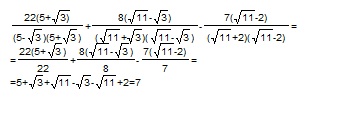 использована формула разности квадратов: знаменатель каждой дроби домножен на сопряженное ввыражение и получилась разность квадратов, потом дроби сокращены