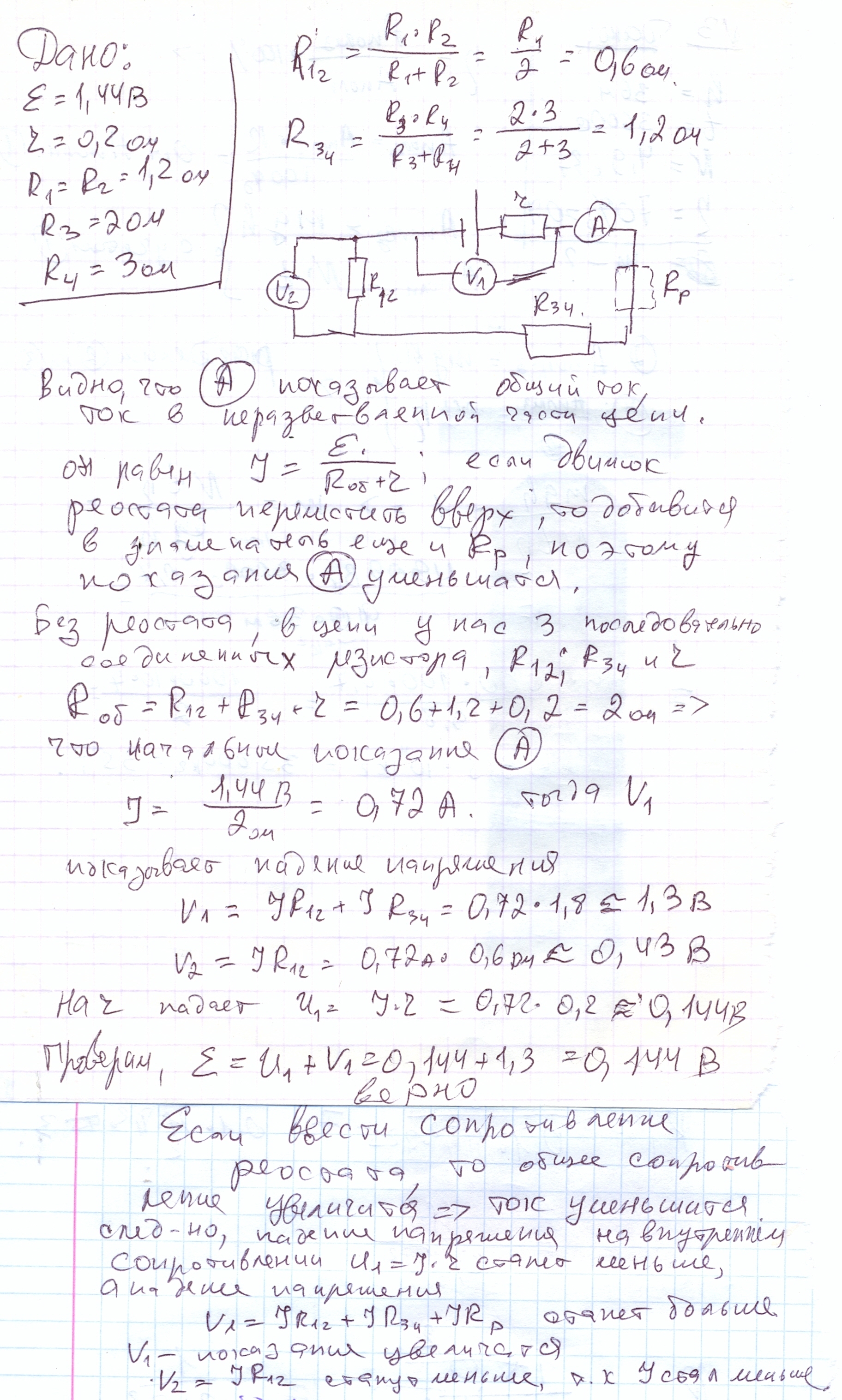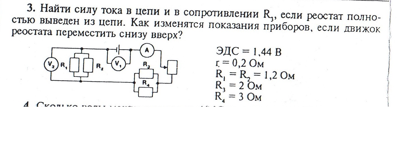 Найти силу тока в цепи и в сопротивлении R, если реостат полностью выведен из цепи. Как изменятся показания приборов, если движок реостата переместить снизу вверх?