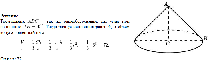 Конус получается при вращении равнобедренного прямоугольного треугольника вокруг катета, равного 6. Найдите его объем, деленный на π