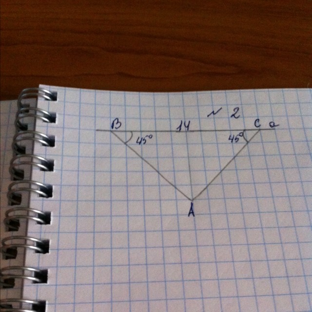 от точки А до прямой а будет 7 см, так как, угол А = 90(поскольку 180-(45+45)=90), после из точки А проводим перпендикуляр на прямую АН и получится что угол А делится пополам следовательно с прямая а делится пополам и ВН = 7 см, а угол ВАН=45 грудусов Угол В=А= 45 следовательно треугольник ВАН равнобедренный, следовательно АН=7 см. вуаля, лолка
