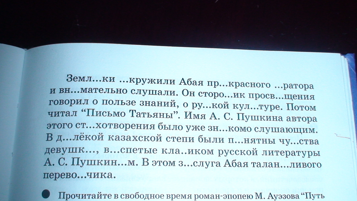 земляки окружили Абая. ПРЕКРАСНОГО ОРАТОРА, и внимательно слушали. Он, сторонник просвещения, говорил о пользе знаний, о русской культуре. Потом читал "Письмо Татьяны". Имя А.С. ПУшкина, автора этого стихотворения, было уже знакомо слушающим. В далекой казахской степи были понятно чувсива девушки, воспетые классиком русской литературы А.С. Пушкиным. В этом заслуга Абая, талантливого переводчика.
