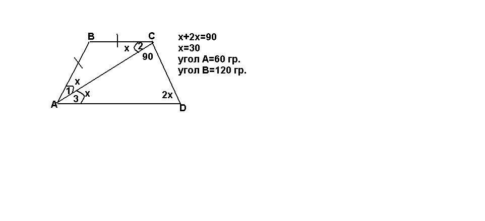 Пусть угол 1=х, тогда уголА=2х и угол D=2x(трапеция равнобедренная)