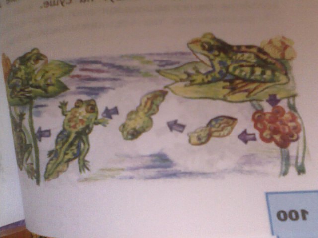 сначала икринки потом головастик и лягушка