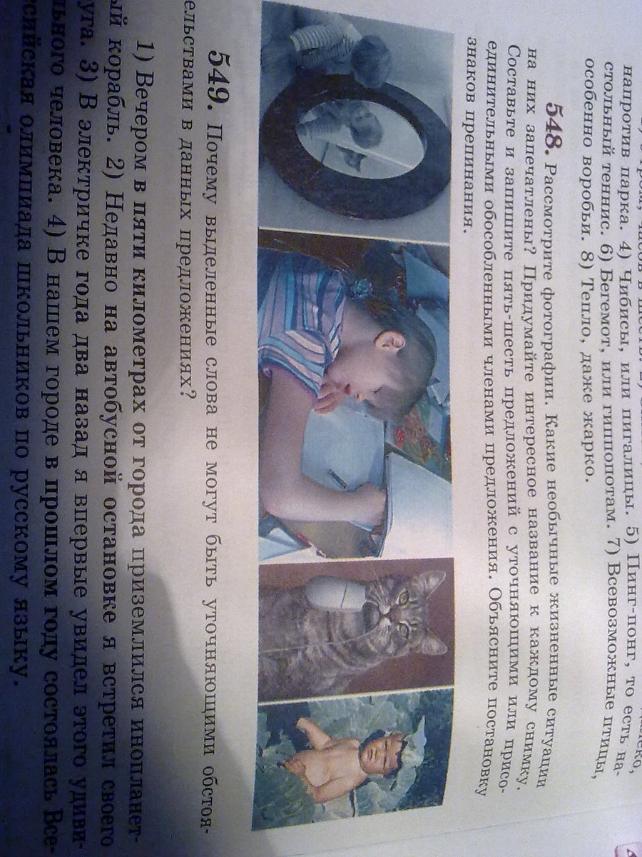 Рассмотрите фотографии. Какие необычные жизненные ситуации на них запечатлены? Придумайте интересное название к каждому снимку. Составьте и запишите пять-шесть предложений с уточняющими или присоединительными обособленными членами предложения. Объясните постановку знаков препинания
