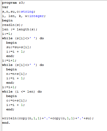 3.Ввести с клавиатуры в одну строку фамилию, имя и отчество, разделив их пробелом. Вывести фамилию и инициалы. Пример: Пирожков Петр Васильевич, а стало : П.В . Пирожков.
