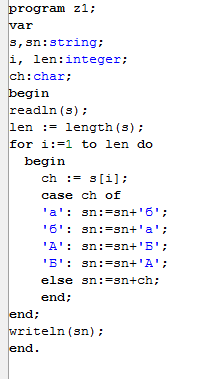 1. Ввести с клавиатуры символьную строку и заменить в ней все буквы "а" на "б" и все буквы "б" на "а".( заглавные на заглавные и строчные на строчные буквы) пример: ааббАА, а после замены стало: ббааББ.