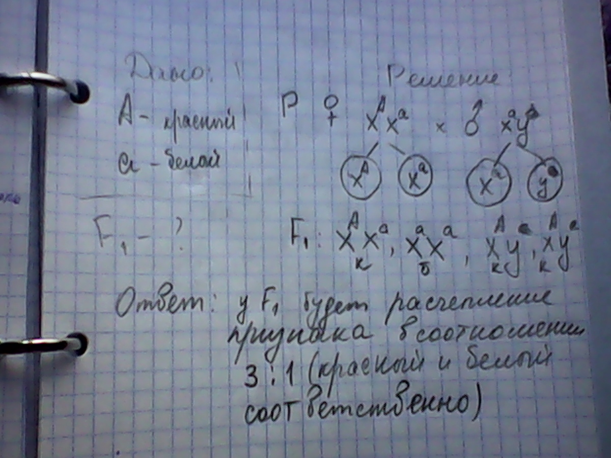 у дрозофилы доминантный ген красной окраски глаз и рецессивный ген белой окраски глаз находятся в Х-хромосоме.Какой цвет глаз будет у гибридов первого поколения,если скрестить гетерозиготную красноглазую самку и самца с белыми глазами?