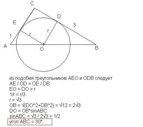 Окружность, центр которой лежит на гипотенузе АВ прямоугольноготреугольника ABC, касается катетов АС и ВС соответственно в точках Е и D. Найти величину угла ABC, если известно, что АЕ = 1, BD = 3.