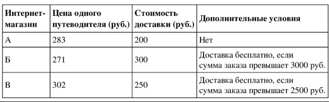 Для группы иностранных гостей требуется купить 10 путеводителей. Нужные путеводители нашлись в трёх интернет-магазинах. Условия покупки и доставки даны в следующей таблице. Определите, в каком из магазинов общая сумма покупки с учетом доставки будет наименьшей. В ответ запишите наименьшую сумму в рублях.