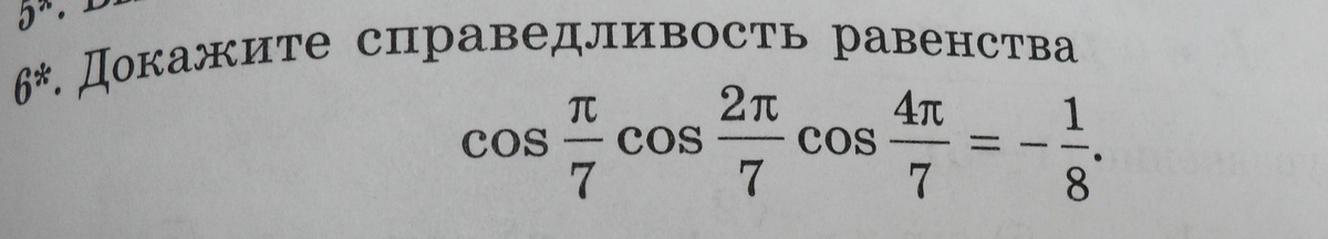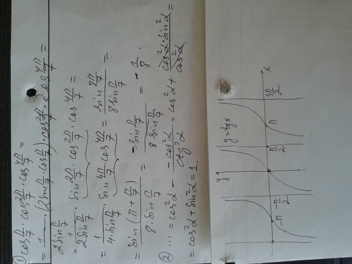 cosπ/7cos2π/7cos4π/7*sinπ/7 : sinπ/7=1/2*sin2π/7*cos2π/7*cos4π/7 : sinπ/7=1/4 sin4π/7cos4π/7 : sinπ/7= 1/8 sin 8π/7 /sin π/7=1/8 sin(π+π/7)/sinπ/7=-1/8 sin π/7 / sin π/7 =-1/8