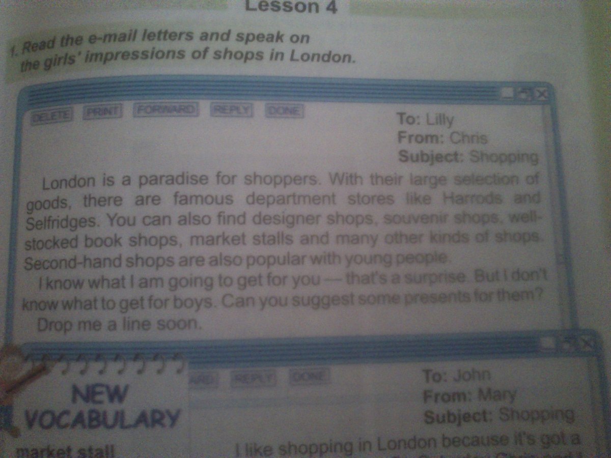 Лондон - это рай для покупателей. В таких знаменитых универмагах как Хэрродс и Селфридж большой выбор товаров. Также можно найти дизайнерские магазины, сувенирные лавки, хорошо оснащенные книжные магазины, рыночные прилавки и многие другие виды магазинов. Секонд хенды также популярны среди молодежи. Я знаю, что куплю тебе - это сюрприз. Но я не знаю, что купить мальчикам. Может ты посоветуешь какие-нибудь подарки для них?