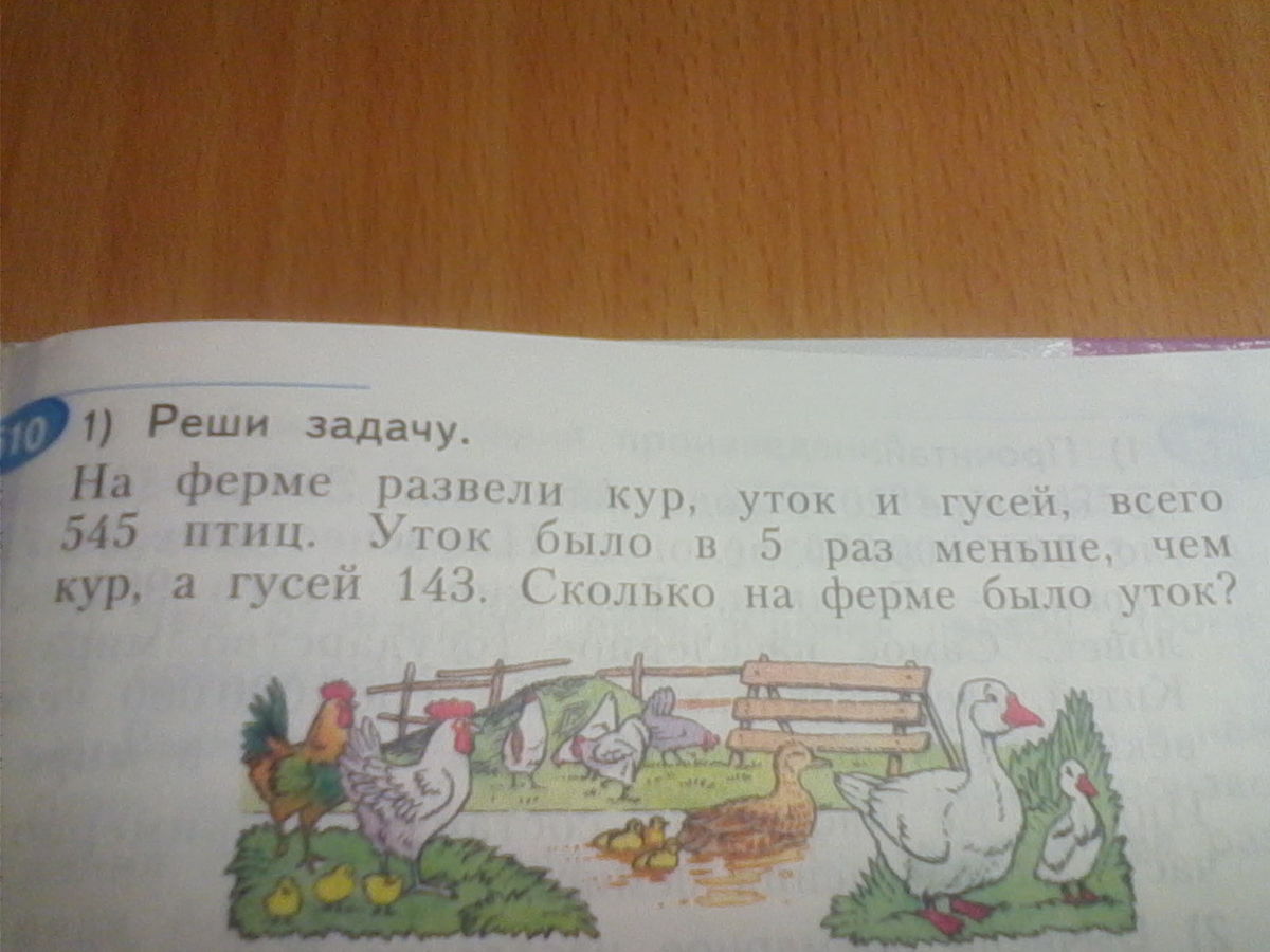 на ферме развели кур уток и гусей всего 545 птиц .Уток было в 5 раз меньше чем кур а гусей 143.Сколько на ферме уток?