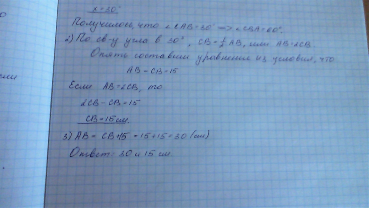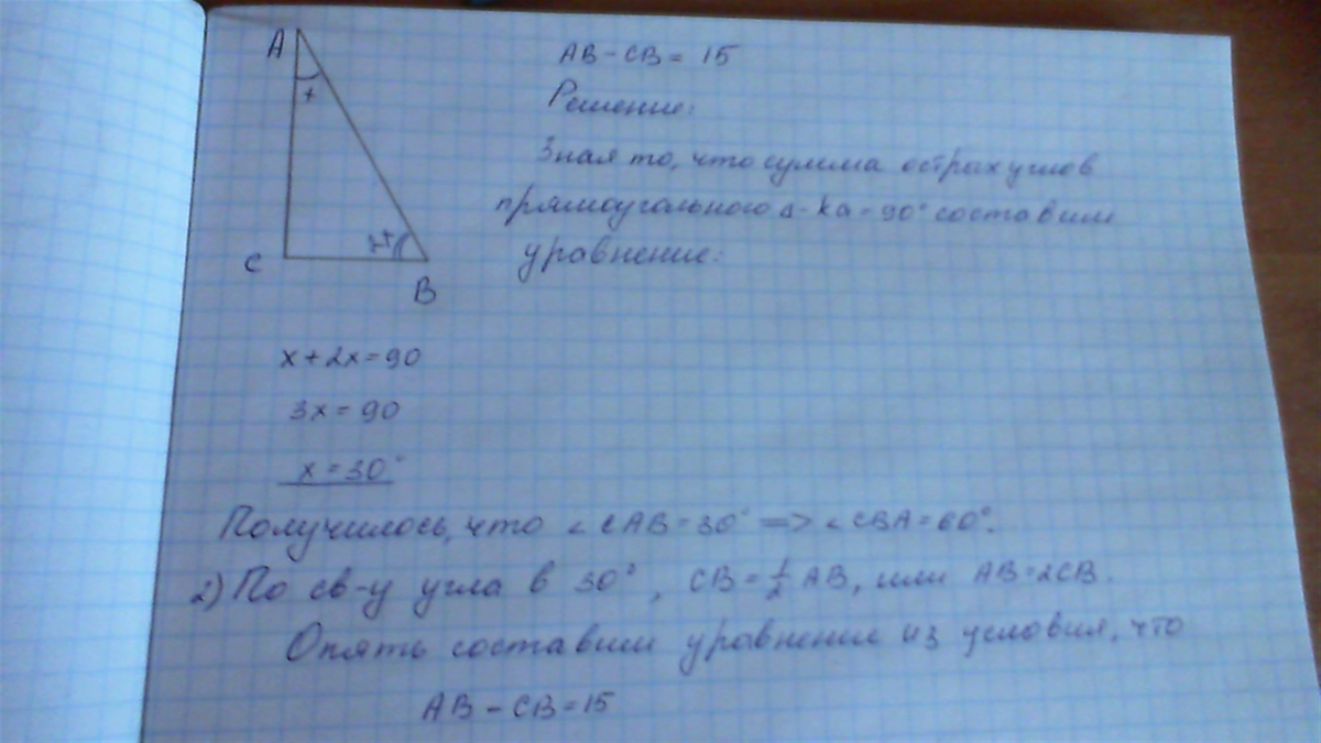 Один из острых углов прямоугольного треугольника в два раза меньше другого, а разность гипотенузы и меньшего катета равна 15 см. Найдите гипотенузу и меньший катет.