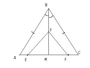 BM биссектриса равнобедренного треугольника, опущенная к основанию, следовательно является так же высотой и медианой. BM перпендикулярно AC, но в треугольнике EDF, так как EM = MF, DM так же медиана, значит треугольник EDF так же равнобедренный, а значит прилежащие к основанию углы равны (180-80)/2 = 50