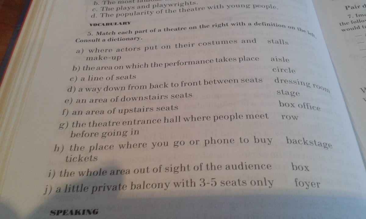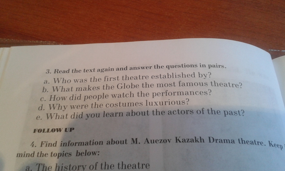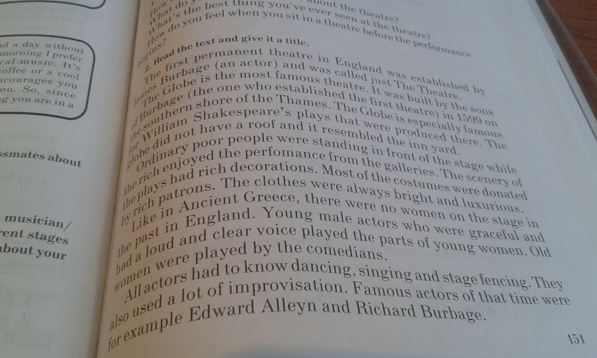 Упр 3. a) The first theatre in England was established by James Burbage. b) The Globe is famous for William Shakespeare’s plays that were produced there. c) Ordinary poor people were standing in front of the stage while the rich enjoyed the performance from the galleries. d) Most of the costumes were donated by rich patrons. e) There were no women on the stage. Young male actors played the parts of young women. Old women were played by the comedians. All actors had to know dancing, singing and stage fencing. They also used a lot of improvisation.