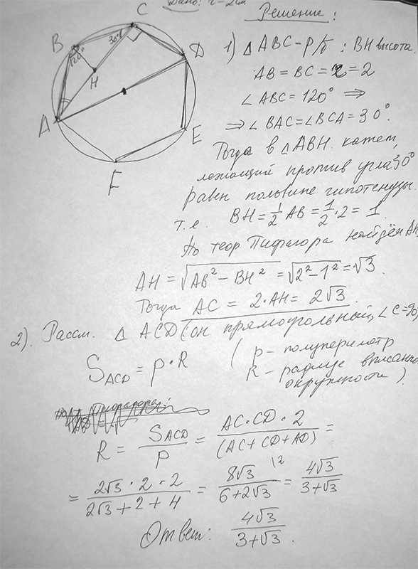 в окружность радиуса 2 вписан правильный шестиугольник abcdef. найти радиус круга, вписанного в треугольник acd