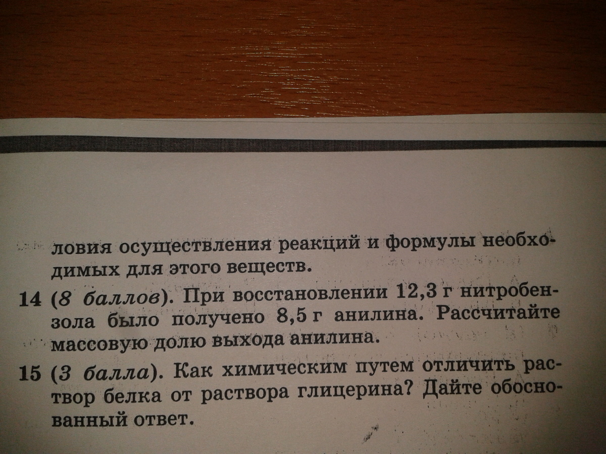 14. Уравнение реакции:Молекулярная формула нитробензола С6Н5NO2. Вычислим молярную массу нитробензола:Вычислим количество вещества нитробензола: v = 12.3 / 123 = 0,1 мольПо уравнению реакции из 1 моль нитробензола получается 1 моль анилина, значит из 0.1 моль нитробензола при теоретическом 100%-ном выходе должно получиться 0.1 моль анилина. ν теор(С6Н7N) = 0.1 моль.Молекулярная формула анилина С6Н7N. Вычислим молярную массу анилина:Вычислим количество вещества практически полученного анилина:v = 8.5/93 = 0.0914 моль Вычислим выход анилина: выход анилина = 0.0914/0.1 * 100 = 91.4%Ответ: выход анилина равен 91.4 %.
