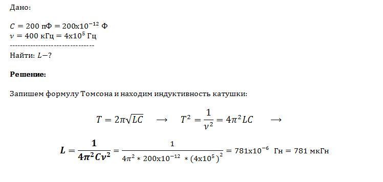 В колебательный контур включен конденсатор ёмкстью 200 пФ. Какую индуктивность нужно включить в контур, чтобы получить в нём электромагнитные колебания с частотой 400 кГц?