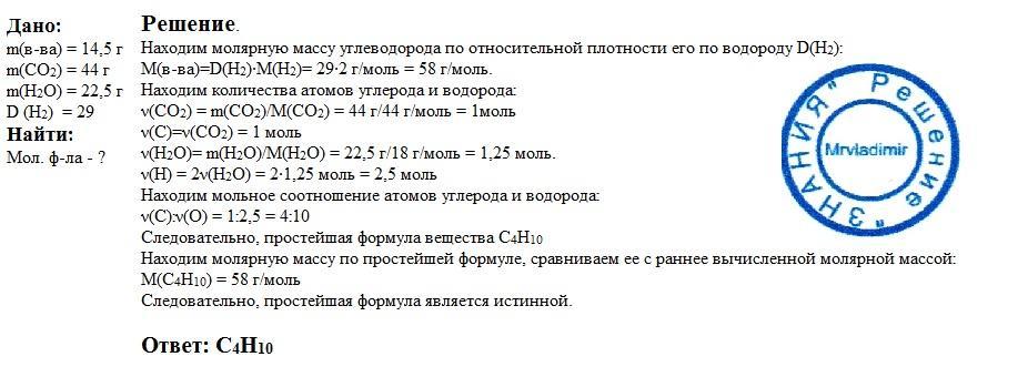 При сгорании 14,5г углеводорода образовалось 44г диоксида углерода и 22,5г воды. Плотность этого соединения по водороду равна 29. Найдите формулу углеводорода.