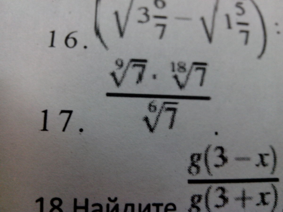 frac{7^{frac{1}{9}}*7^{frac{1}{18}}}{7^{ frac{1}{6}}}=7^{ frac{1}{9}+ frac{1}{18}- frac{1}{6}}=7^{ frac{1}{6}- frac{1}{6}}=7^{0}=1