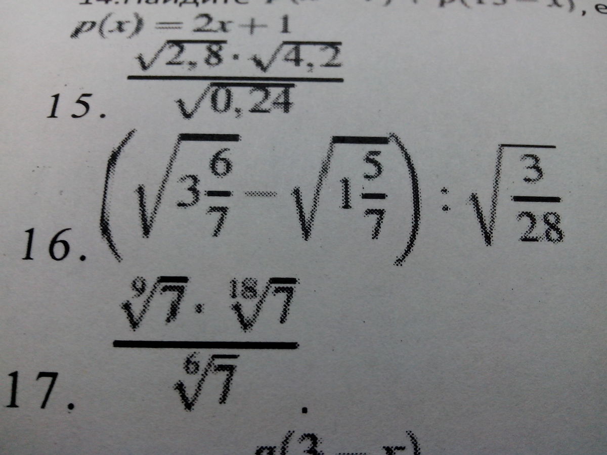 ( sqrt{ frac{27}{7}}- sqrt{ frac{12}{7}})* sqrt{frac{28}{3}}=sqrt{ frac{27}{7}}*sqrt{frac{28}{3}}-sqrt{ frac{12}{7}}*sqrt{frac{28}{3}}= sqrt{ frac{27*28}{7*3}}- sqrt{ frac{12*28}{7*3}} \ = sqrt{9*4}- sqrt{4*4}=6-4=2