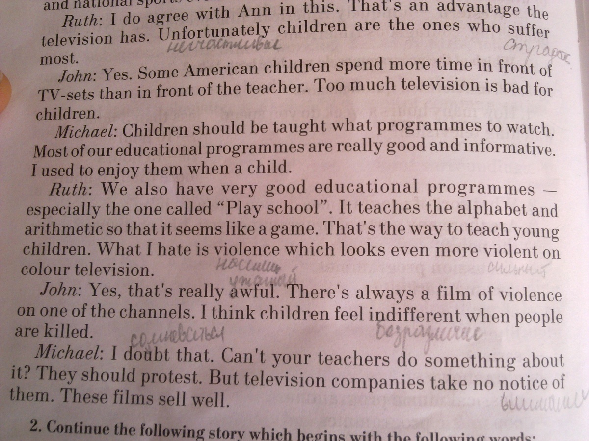 Джон: да это действительно ужасно. Всегда идёт какой-то фильм с насилием на одном из каналов. Я думаю, дети привыкают к безразличию, когда видят убийства. Михаил: я сомневаюсь в этом. Разве ваши учителя могут сделать с этим что-то? Они должны выражать протест! Но телевизионные компании не замечают этого, фильмы с насилием слишком хорошо продаются.