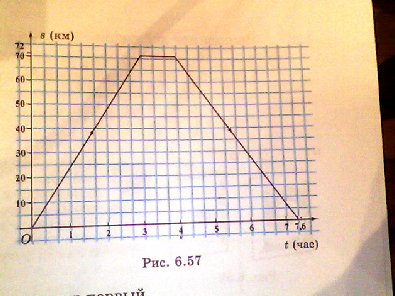 На рисунки 6,57 изображен график движения катера по реке. Катер плыл от пункта А до пункта В и, остановившись там на 1 ч, вернулся обратно в пункт А. На все это он потратил 7,6 ч. Используя график, найдите скорость течения реки.