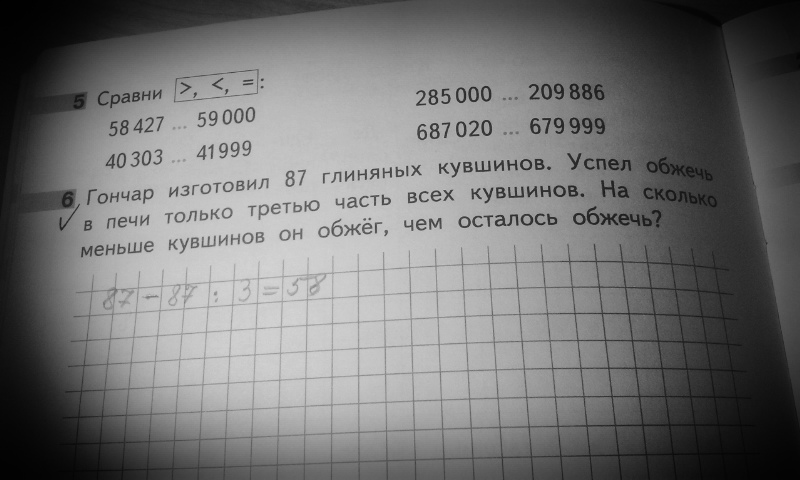 Задача №6. Проверьте задачу: 87–87:3=58(к.)